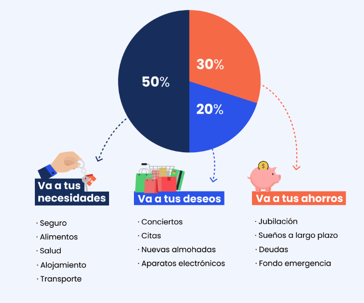 Una estrategia práctica es la regla 50/20/30, que fija porcentajes claros para gastar y ahorrar cada mes. Según esta regla: